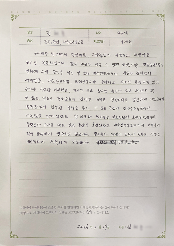 [자율신경실조증] 진전, 불면, 자율신경실조증 45세 치료 후기